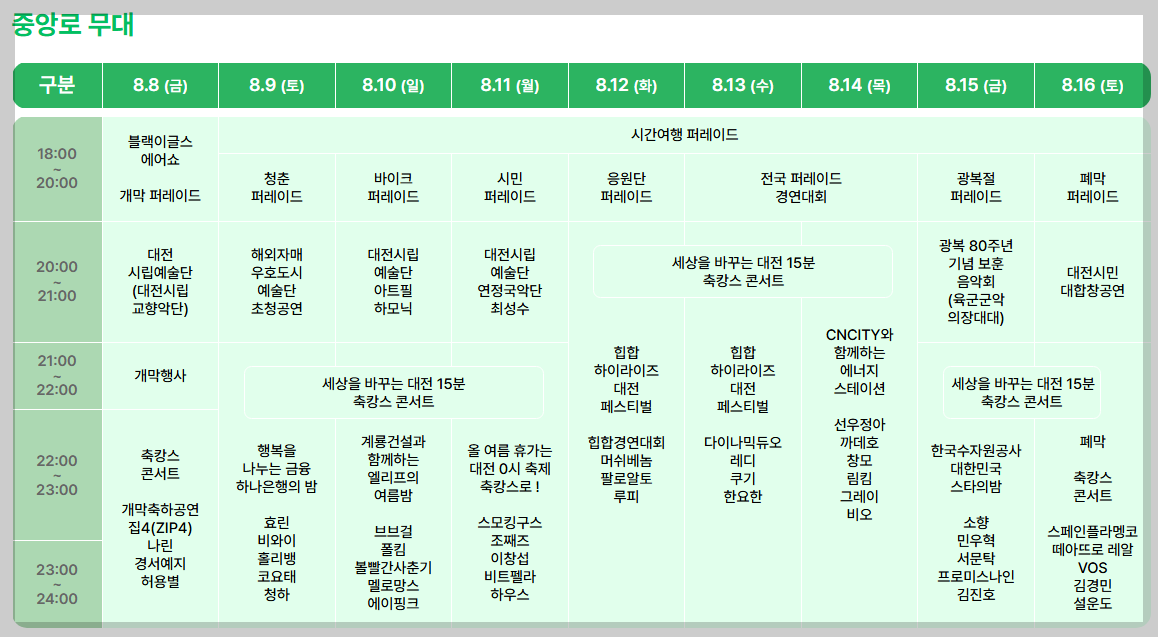 주요 무대는 대전 중앙로 특설무대와 대전역 앞 특설무대 두 곳으로 나누어져 있습니다. 중앙로 무대에서는 K‑POP과 대중가수 공연이 중심이며, 대전역 무대에서는 트로트, 전통 공연, 시민참여 프로그램 등이 열릴 예정입니다.