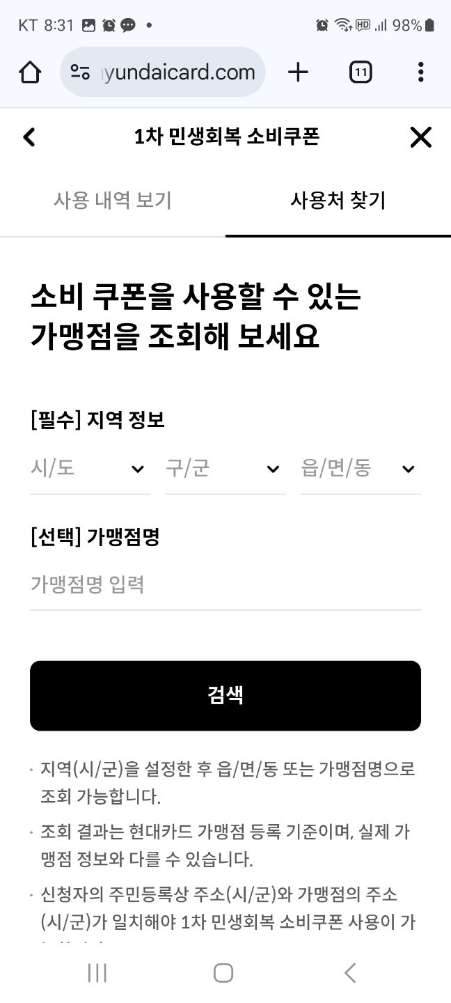 - 메인 배너 또는 팝업에서 ‘민생회복 소비쿠폰’ 클릭